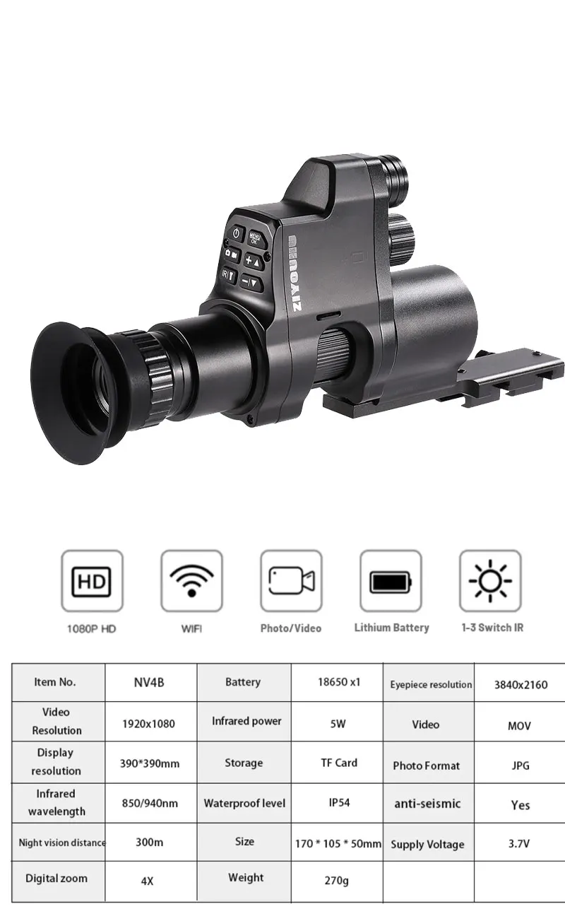 NV4B Clip-on Night Vision Scope Device Round Screen Crosshair 4X Zoom HD Video Camera Attach Night Hunting IR Digital Monocular