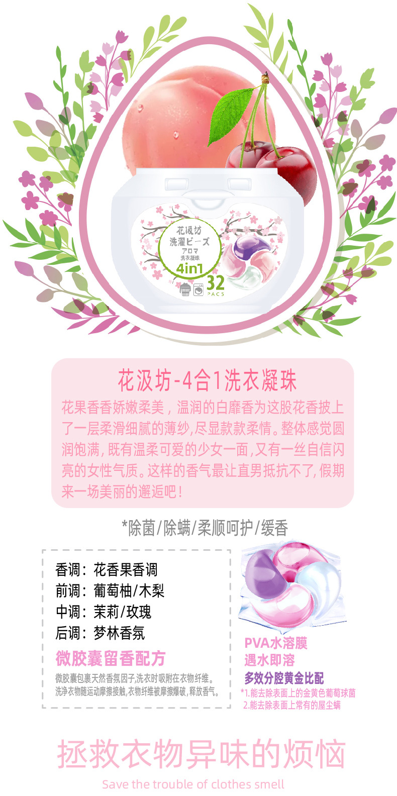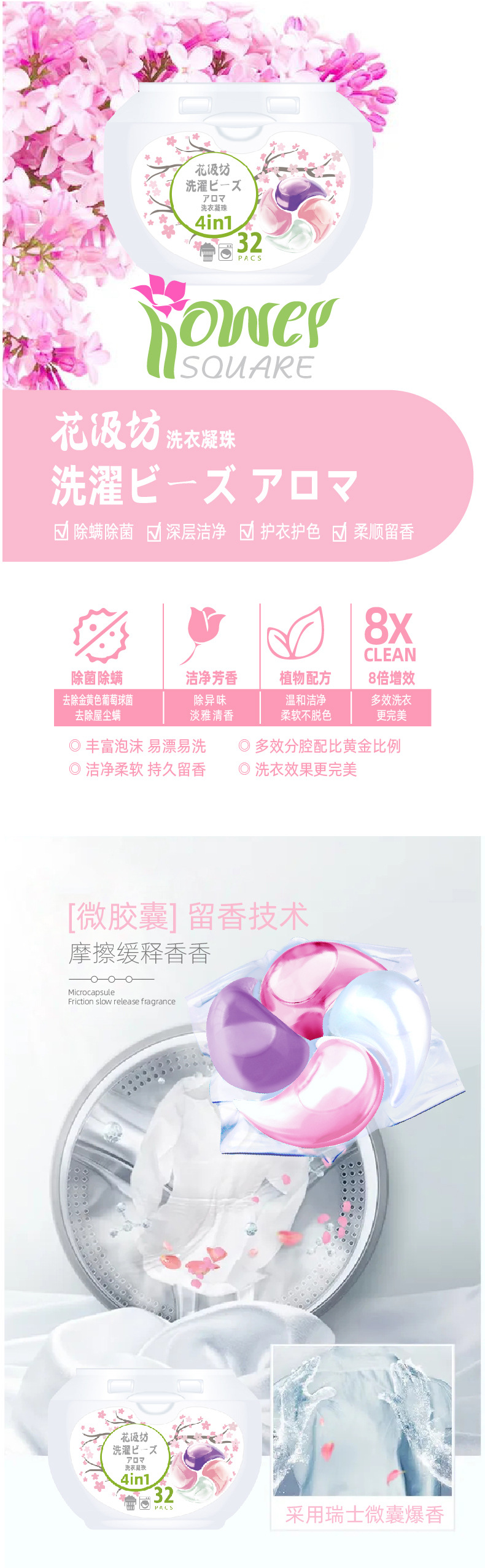 Flower swabbing square 4-in-1 laundry condensation bead box clean, flexible, bactericidal, mite and fragrance 8 times clean power wholesale