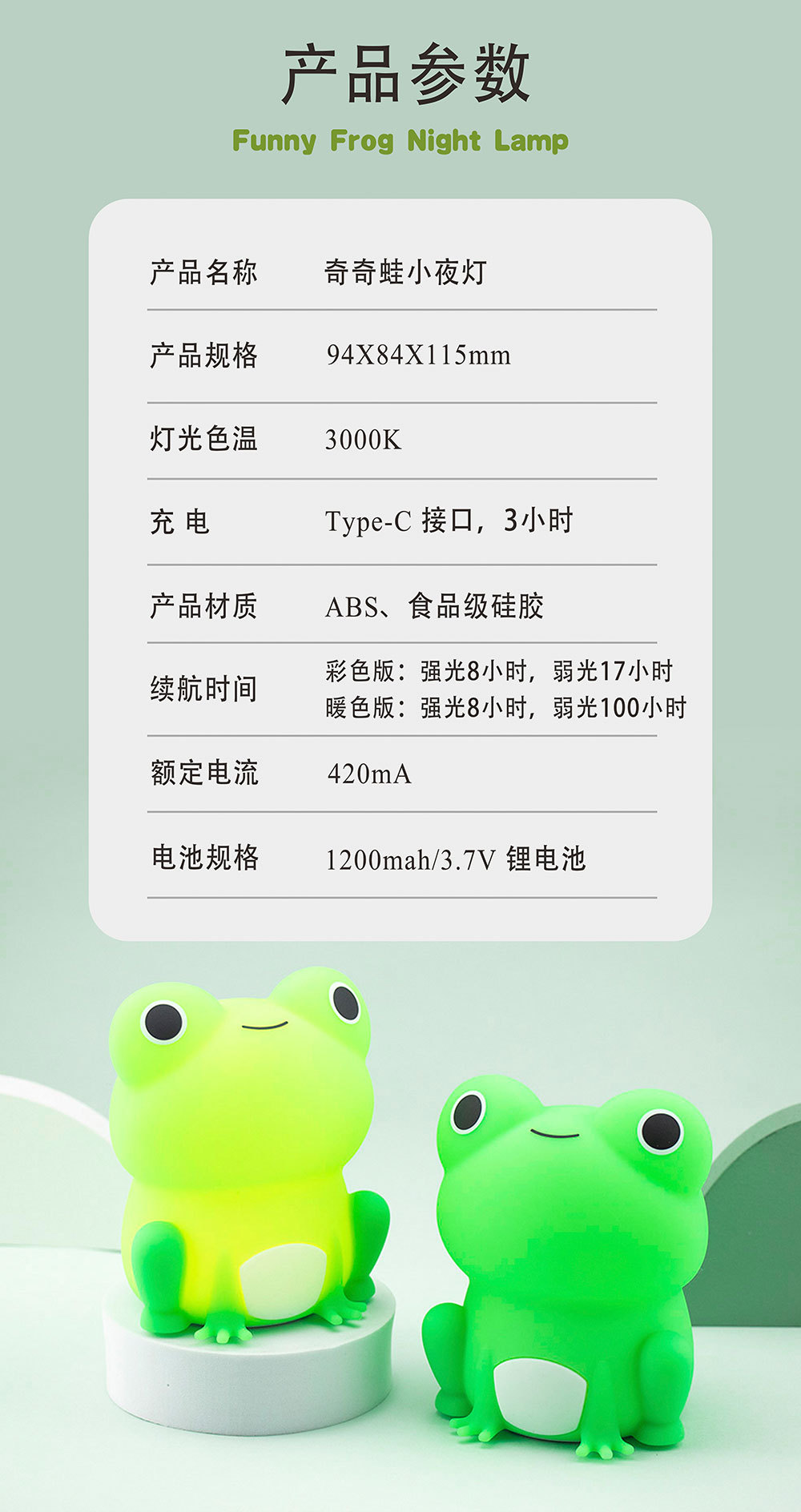 Product Name: Qiqi Frog Night Light Product Model: E-6016 Product dimensions: 94*84*115mm Product materials: Silicone, ABS 电池规格:1200mAh/3.7V 锂电池 Rated current: 420mA Light color temperature: 3000K Charging time: approximately 3 hours (Type-C interface) Battery life: The color version lasts approximately 8 hours in strong light and about 17 hours in low light The warm color version lasts approximately 8 hours in strong light and about 100 hours in weak light Color box size: 97*87*120mm Product weight: 223g (gross weight) Packing quantity: 60pcs 装箱尺寸:46*41*39 CM Packing weight: 14.7Kg (gross weight)