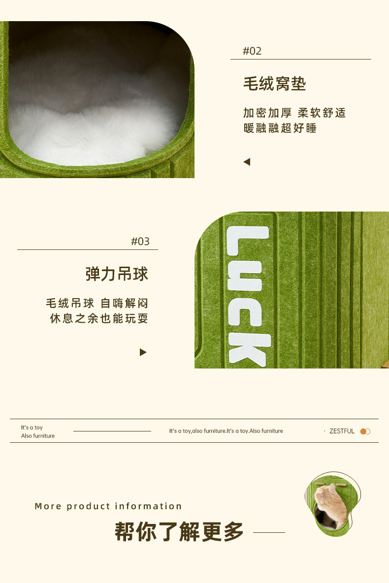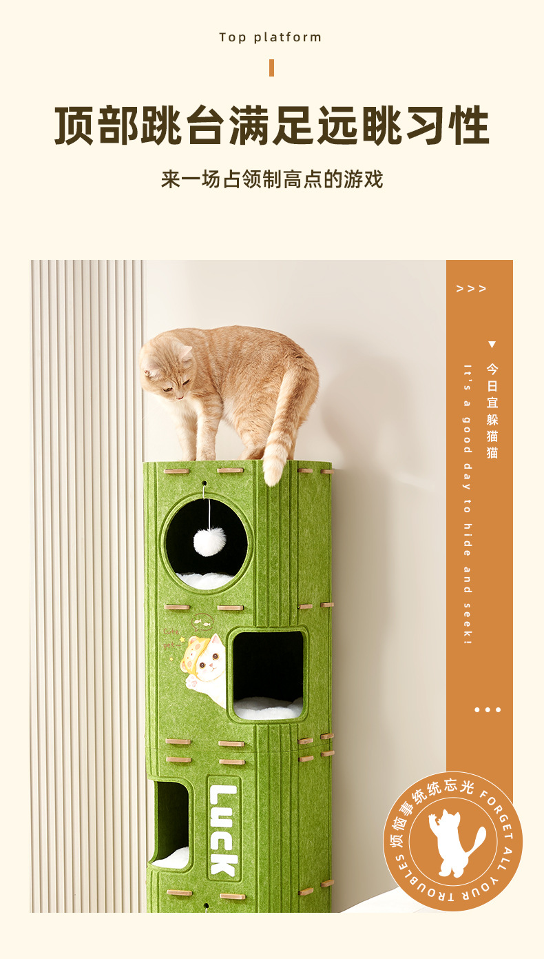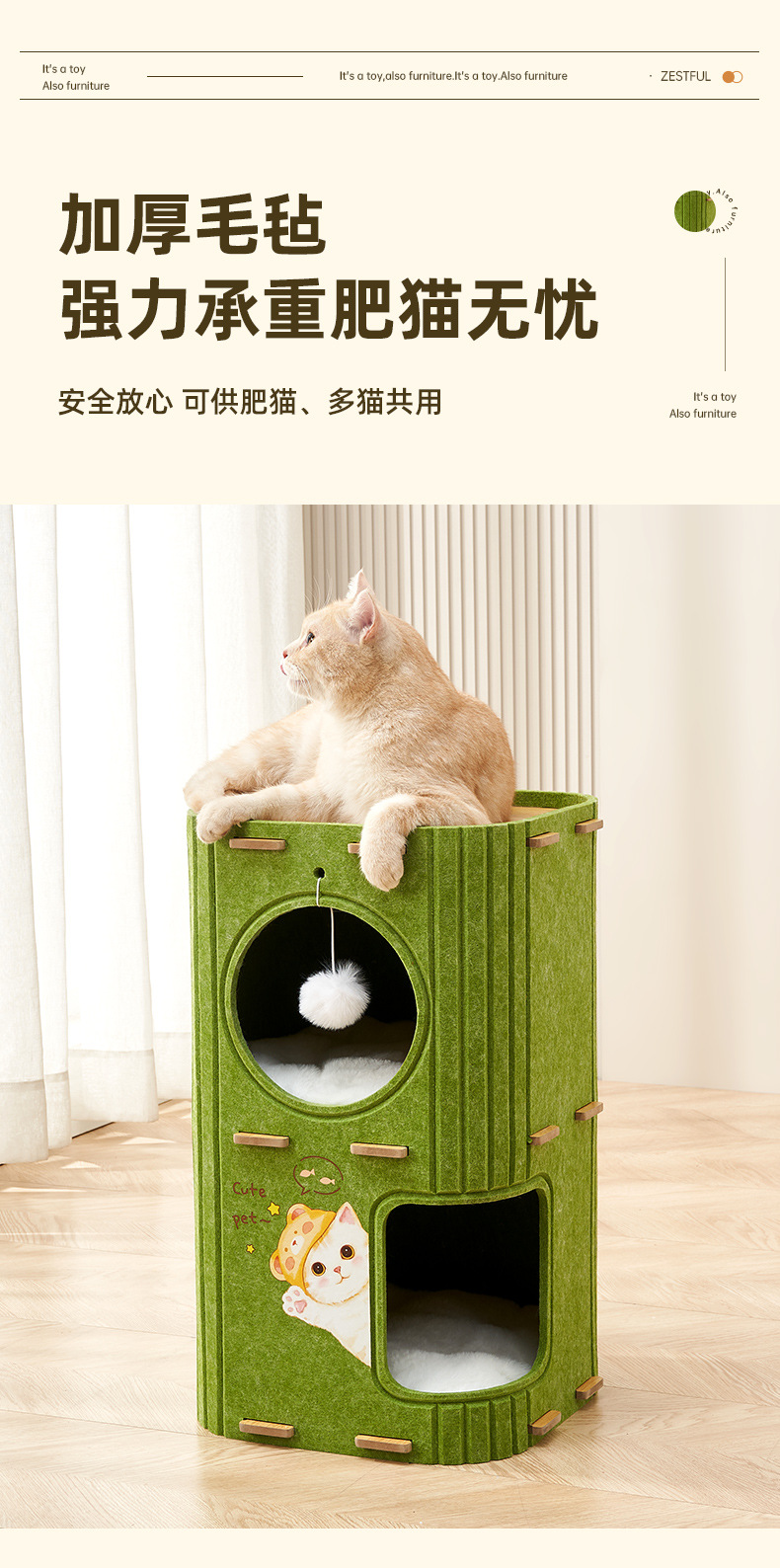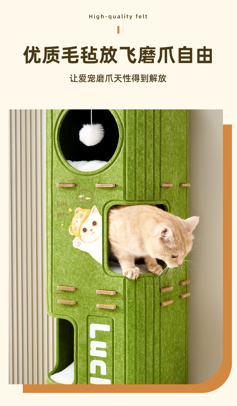 The cat scratch-board and cat bed are integrated, wear-resistant and non-flaking. The solid wood cat climbing frame takes up little space. The sisal pad and cat scratch-pad are cat toys