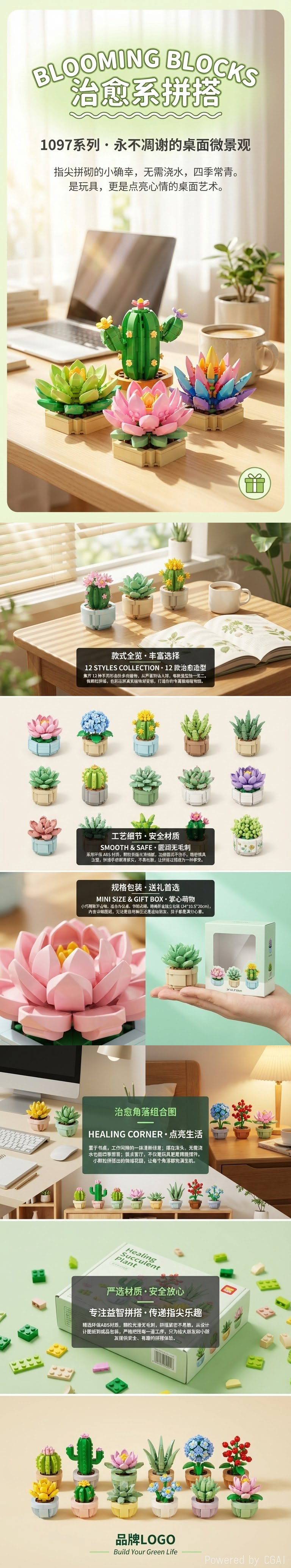 12 types of colorful and shaped succulent plant building block toys, fun handmade and educational children's toys for flower pot assembly