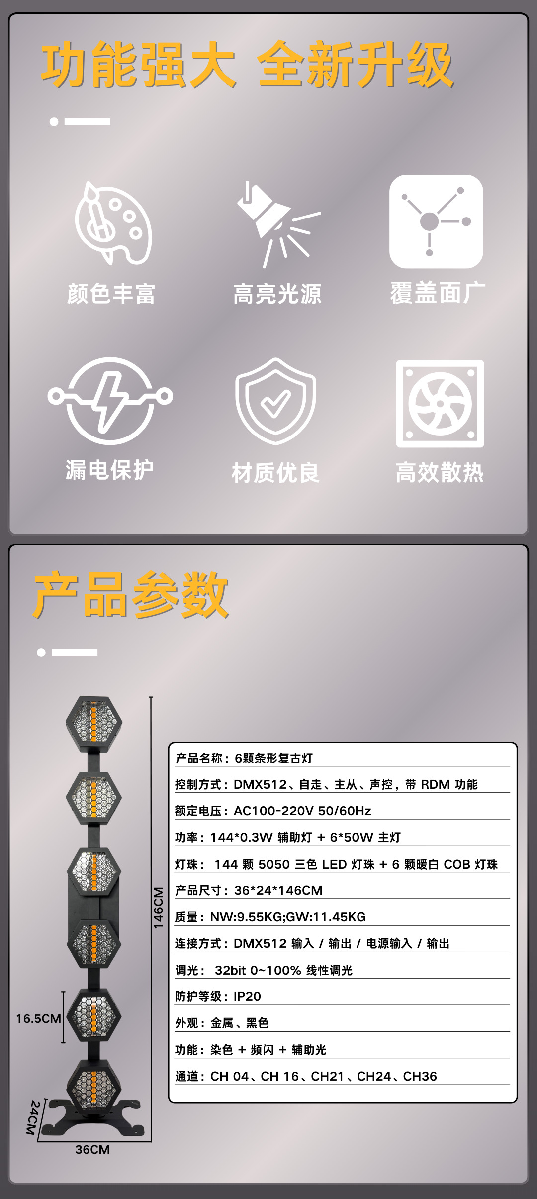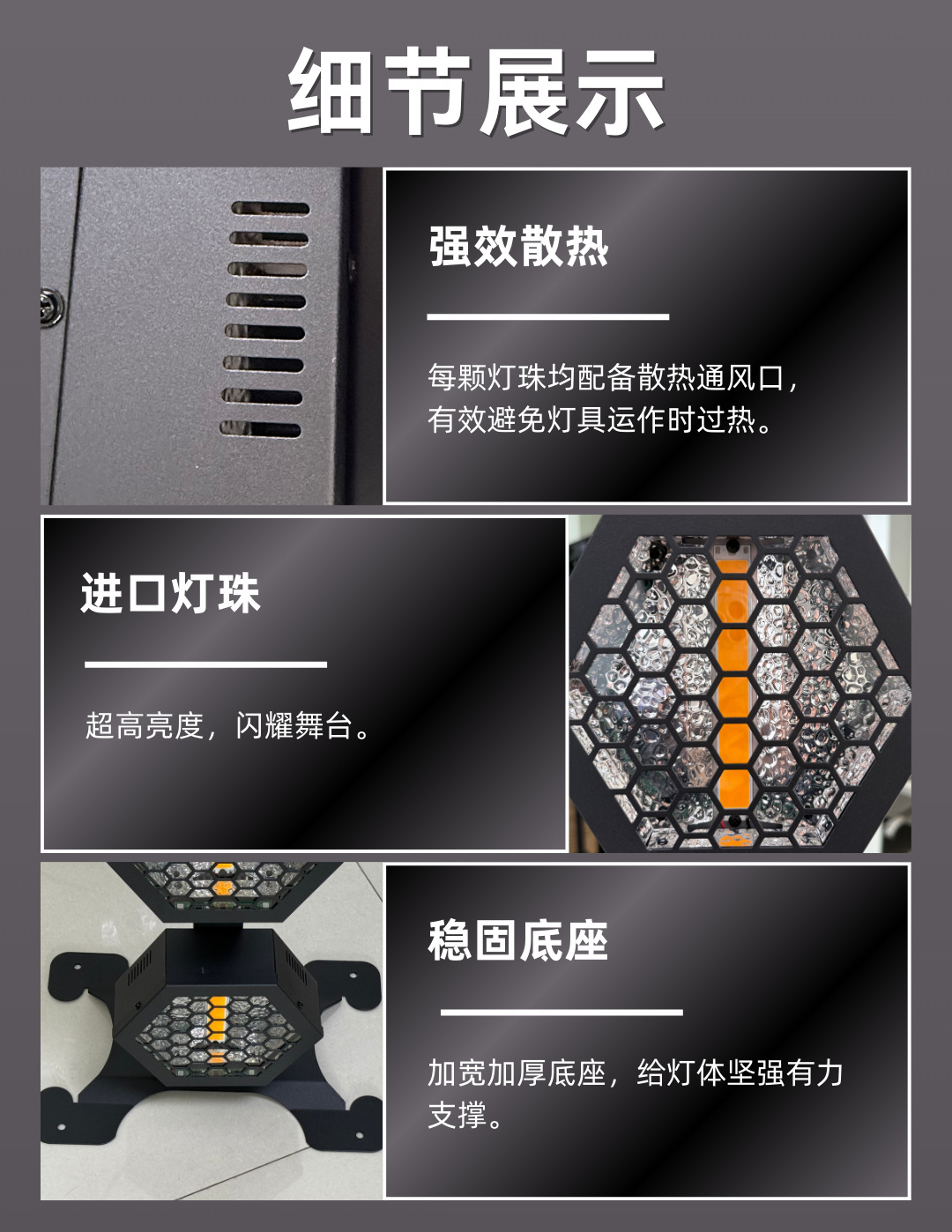 Power: 144*0.3W auxiliary light + 6*50W main light (Actual power: 200W)